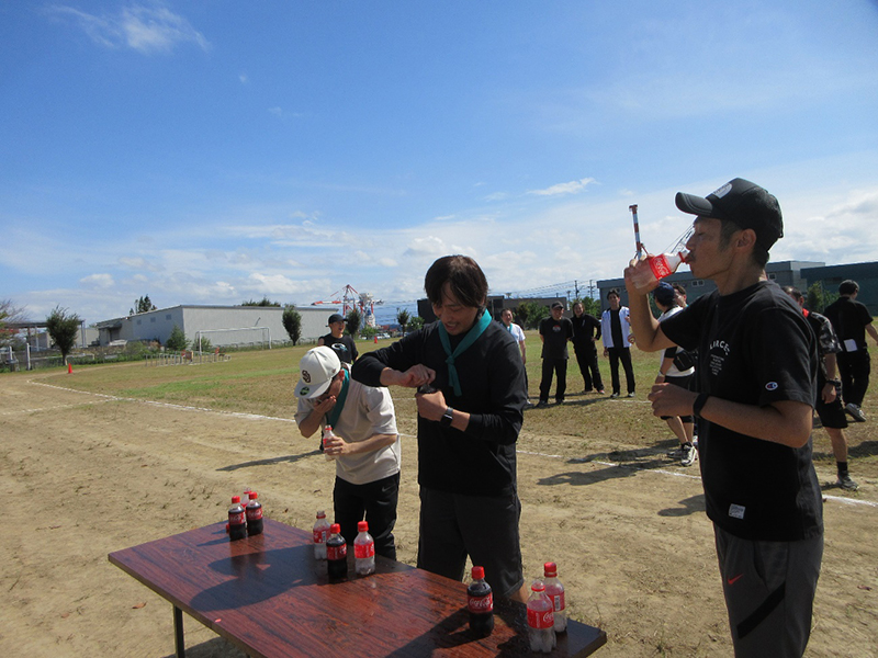 お昼休み前の余興、役職対抗別、コカ・コーラ一気飲み対決~(笑)