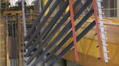 コンテナと呼ばれる加熱された筒の出側にダイス(金型)を固定し、コンテナ内にビレットを挿入、油圧プレスの押出力でダイスに開いた形状のアルミニウム形材を押し出します。
