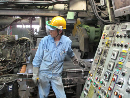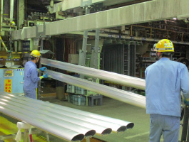 押出の原理は簡単!熱して柔らかくなったアルミニウムを、ダイスという穴の開いた金型に押し通します。すると色々なかたちの形材が作れるのです。